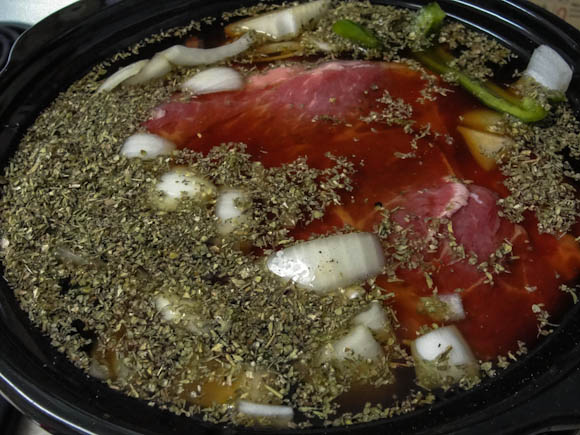 Here's what you'll need: 3-4 pounds of cheap beef (sirloin butt, top round, or bottom round), a couple of sweet onions, a couple of bell peppers, some beef broth, worcestershire sauce, garlic powder, italian seasoning, salt, and pepper.